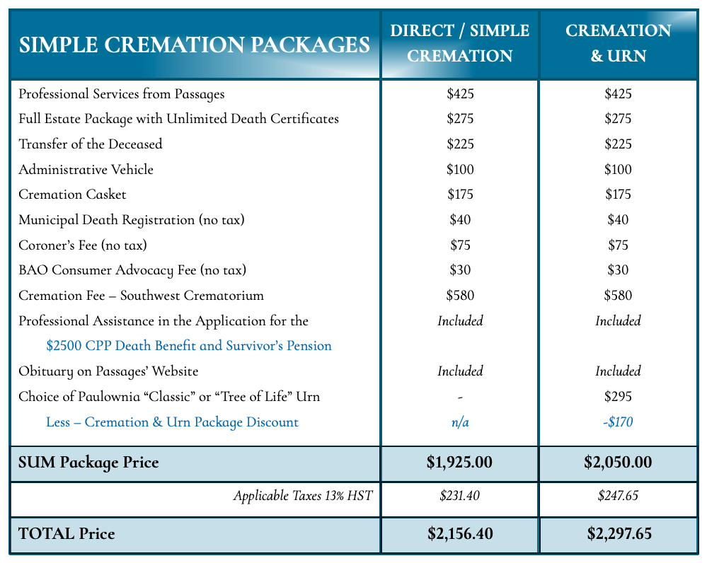 Passages is dedicated to making a difficult time a little bit easier. As such, each cremation package includes: